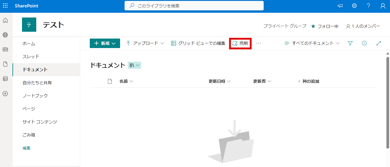 次にSharePointのサイトで「同期」ボタンを探します。